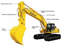 Шөмішпен қазу күші (ISO) 308 КН Тұтқамен қазу күші (ISO) 233 КН Шөміштің максималды көтеру биіктігі 10 155 мм Қазудың максималды тереңдігі 6 740 мм Шөміштің сыйымдылығы 2,8 м3 KOMTRAX Step-1